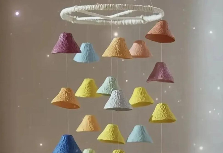 接着,可以让孩子一起参与,用颜料给这些小窝涂上喜欢的颜色,或者画上一些简单的小图案。等颜色完全干了之后,用针线把这些小窝一个一个串起来,下面可以再系上小铃铛或者彩色绳子。