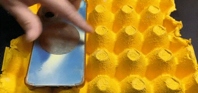 先找一个干净、没有破损的鸡蛋托盘,把它稍微清理一下。然后拿手机在托盘上比一比大小,用剪刀剪下两到三个鸡蛋窝的长度,一般这个尺寸就刚刚好。鸡蛋托中间是向下凹的,正好可以卡住手机底部。