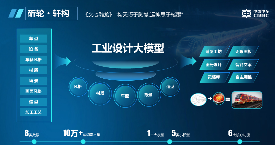 “城市交通车辆外观造型与工业设计人工智能大模型——斫轮·轩构”,由中车重庆公司联合中车唐山公司共同开发。设计人员只需输入简单的文字描述,基于文生图、图生图、多图融合、局部重绘等功能,即可在8秒内生成设计方案,并可对颜色、风格、背景等多条件精准控制。首次实现了3D模型渲染辅助AI生成与多图融合生成,将车辆外观设计效率及创新度有效提升,推动车辆设计从“经验驱动”迈向“数据与灵感驱动”。