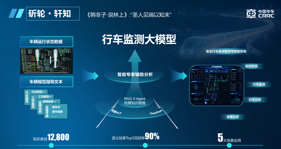 “轨道交通智能安全行车监测大模型——斫轮·轩知”,由中车重庆公司联合中车四方所共同开发。有效提升轨道车辆运行的安全性与管理水平,核心在于沉淀智能问答、智能专家辅助分析能力。结合异常识别结果,工作人员通过语言问答即可实现智能交互、辅助数据分析、生成处置建议,实现检索查询时间缩减60%,故障处理效率提升40%,全方位保障列车行车安全。